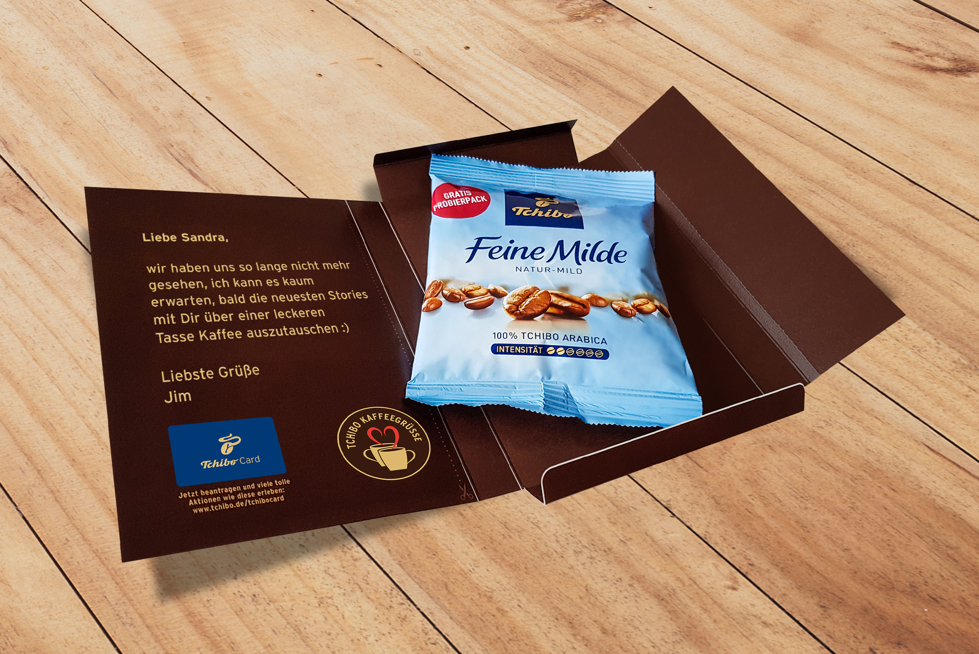 Das fragten wir für Tchibo auf einer Microsite alle Tchibo-Card Besitzer und im Nachgang auch die Facebook-Fans und Newsletter-Abonnenten. Und wer Lust hatte, konnte kostenlos an Freunde oder Familie die Tchibo Kaffeegrüße versenden. Wir gestalteten ein plakatives Icon und eine kompakte Versandbox, die dann – mit personalisierten Grüßen und einer kleinen Packung Kaffee versehen – an die Adressaten verschickt wurde. Eine tolle Aktion, die großen Anklang fand. Wer bekommt da nicht Lust auf einen Kaffee?!